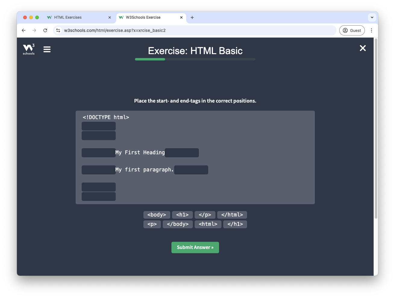 Syntax exercises are available in all W3Schools Free Tutorials.