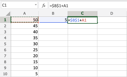 Let's have a look at an example where we add B(5) to the range A1:A10 using absolute reference and the fill function.