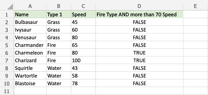 Now each row has a check for both being Fire type and Speed greater than 70: