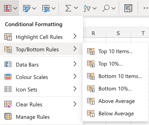 Above and Below Average Rules are found in the Top/Bottom Rules part of the conditional formatting menu:
