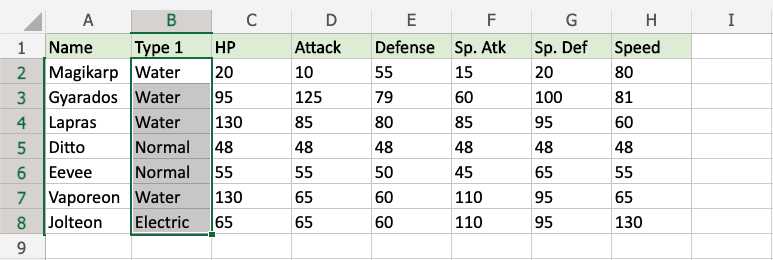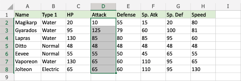 Note: Eevees's Attack value is 55, but is not highlighted, since the rule does not include the specified value itself.