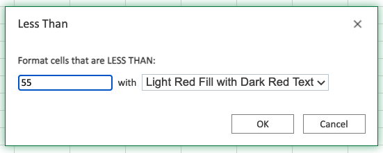55into the input field - Select the appearance option "Light Red Fill with Dark Red Text" from the dropdown menu