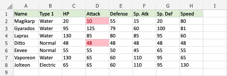 Only Magikarp and Ditto have Attack values less than 55, so these values are highlighted.