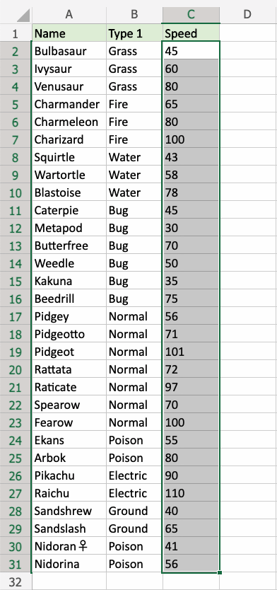 C2:C31for Speed values