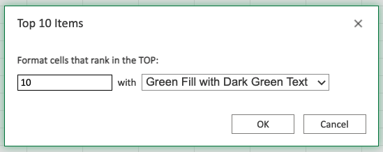 Repeat the steps, but instead choose Top 10%... in the menu and select the "Green Fill with Dark Green Text" appearance option.