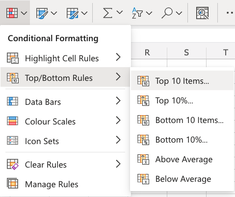Here is the Top/Bottom Rules part of the conditional formatting menu: