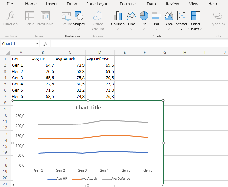 The chart gives a visual overview for the average Pokemon stats over generations.