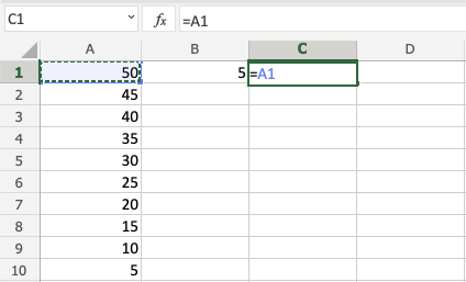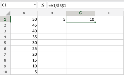 Good job! You have successfully used absolute reference to divide B1(5) with the range A1:A10.