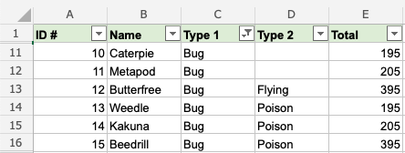 Good job! The range was successfully sorted by Type 1, Bug. All shown Pokemons are Bug type.