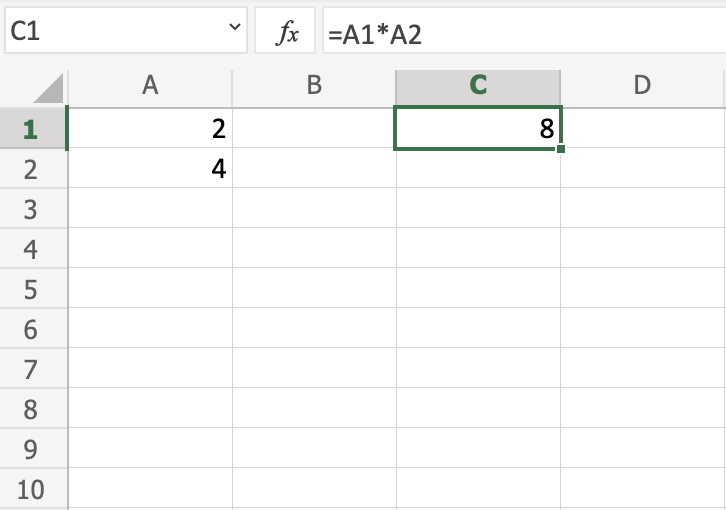Lets change from addition to multiplication, by replacing the (+) with a (*). It should now be =A1*A2, press enter to see what happens.