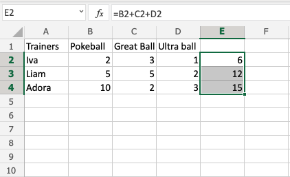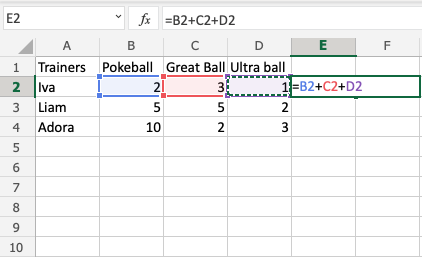 Let's help Iva to count her Pokeballs. You find Iva in A2(Iva). The values in row 2 B2(2), C2(3), D2(1) belong to her.