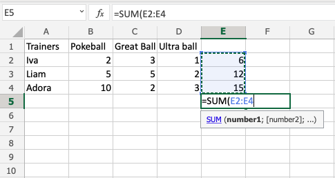 • Range B2:D4: Amount of Pokeballs, Great balls and Ultra balls