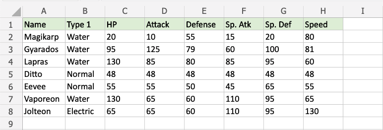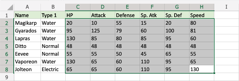 1. Select the range C2:H8 for all of the stat values