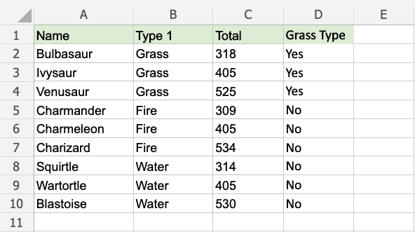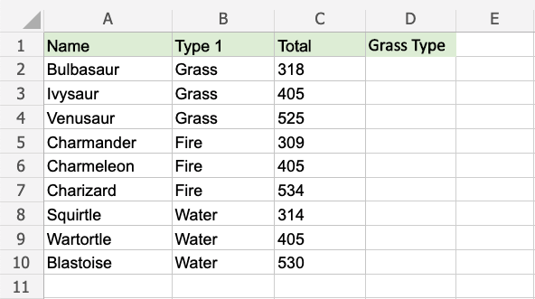 The condition is if the "Type 1" value for the Pokemon is "Grass".