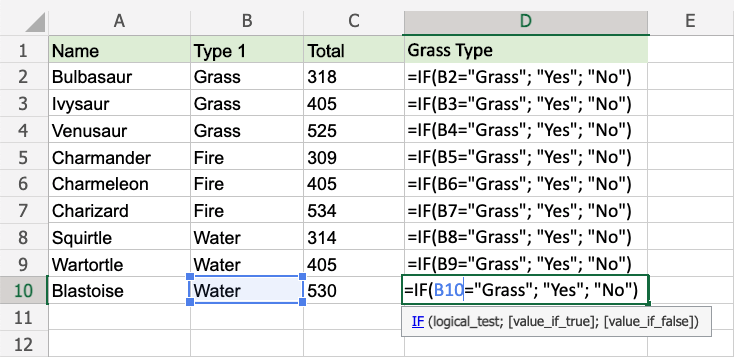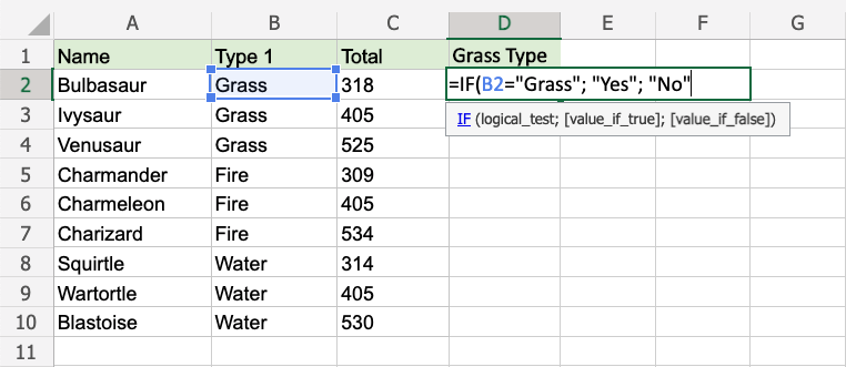 Since the value in cell B2 is "Grass", the condition is true and the function will return "Yes".