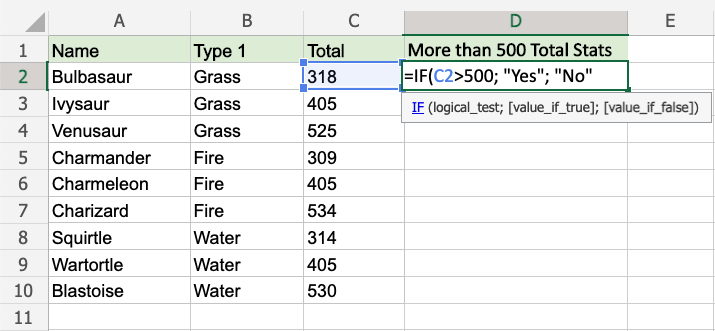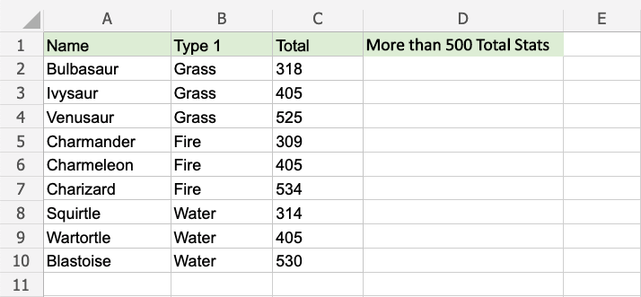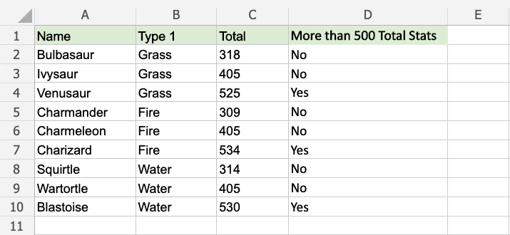 Now, each row has a check for having more than 500 total stats: