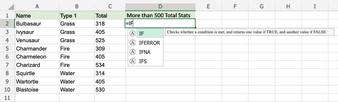 The IF function is a premade function in Excel, which returns values based on a true or false condition.