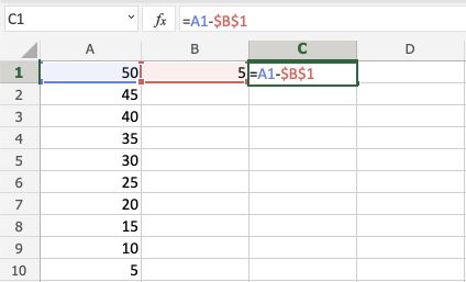 You got it! You have successfully used absolute reference to subtract B1(5) from the minuend range A1:A10.