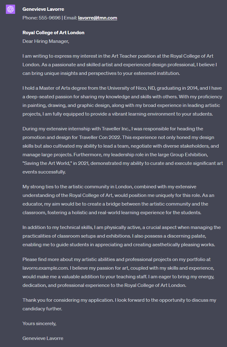 Create a Cover Letter for me, Genevieve Lavorre. Graduated in 2014 from the University of Nico, ND, with a master's degree in arts. Completed an extensive internship with Traveller Inc., where I was the head promoter and head of design for Traveller Con 2022. In addition, I led a large Group Exhibition called "Saving the art world" in 2021. Can you create a new resume emphasizing my education, skills, and experience? I am trained and proficient in painting, drawing, and graphical design. My portfolio is available at lavorre.example.com . Contact information: E-mail: lavorre@tmn.com, Phone: 555-9696. I also have experience with tough negotiations, am physically active, and have a discerning palate. I am looking for a job at the Royal College of Art London as a teacher. I have deep ties to the artistic community of London, and because of my extensive knowledge of the school, I would be uniquely qualified. If you need any more information to continue, ask.