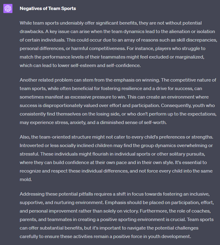 For an article about "The importance of team sports for youth development", write a section about "Negatives of Team Sports - Highlighting possible pitfalls of Team Sports, specifically the danger of alienating and isolating individuals":