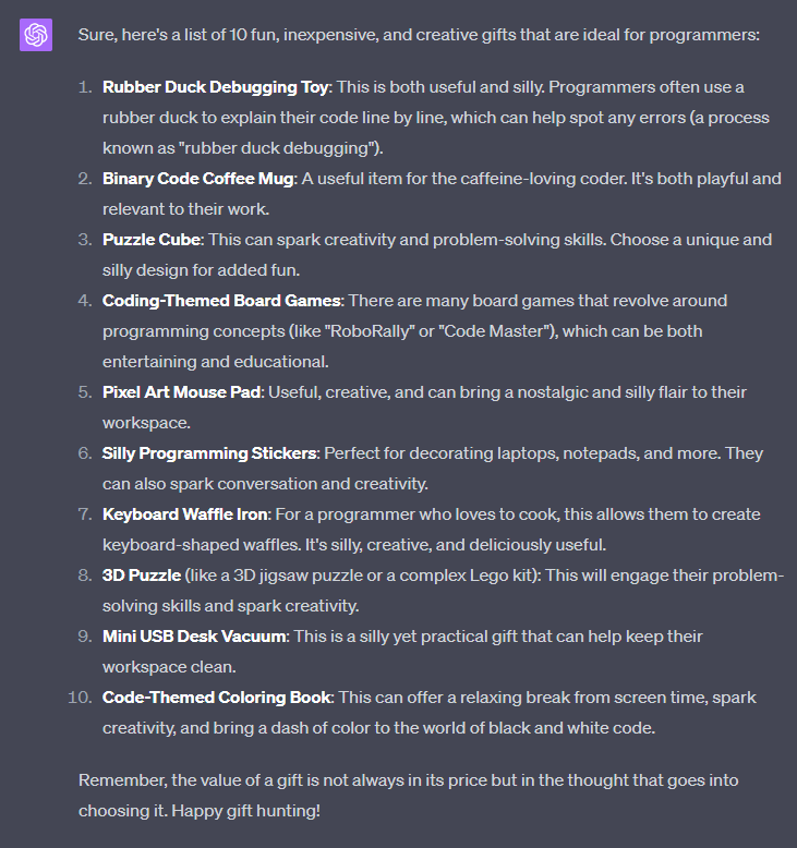 Create a list of 10 fun and inexpensive toy gifts to programmers based on the following criteria: