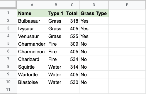 The function can be repeated with the filling function for each row to perform the same check for each Pokemon: