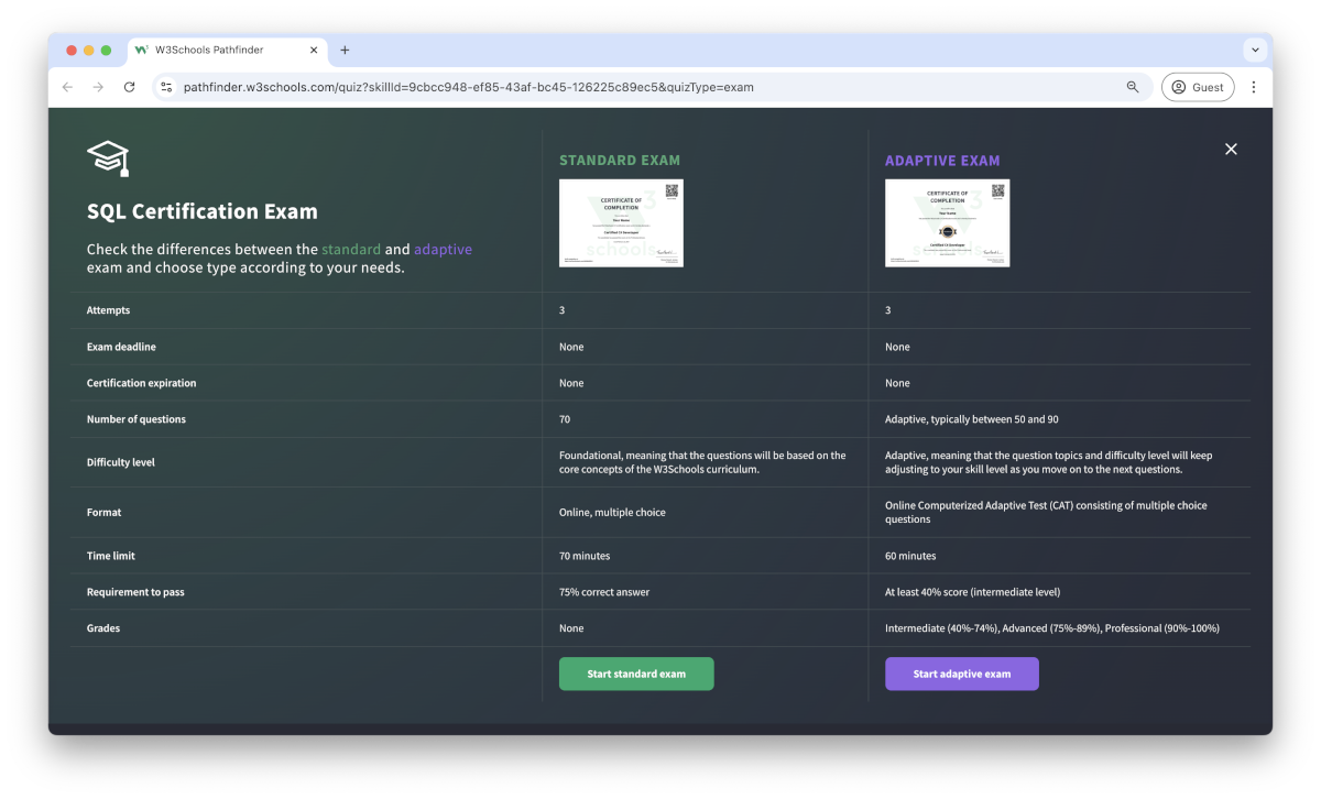 The SQL exam is a test that summarizes the W3Schools SQL syllabus.
